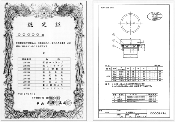お客様に安心してお使いいただくために、当工業会では各社の製造する JCW規格品について審査を行い、適合品にはその製品仕様図に工業会 認定済印を捺印しています。 |
