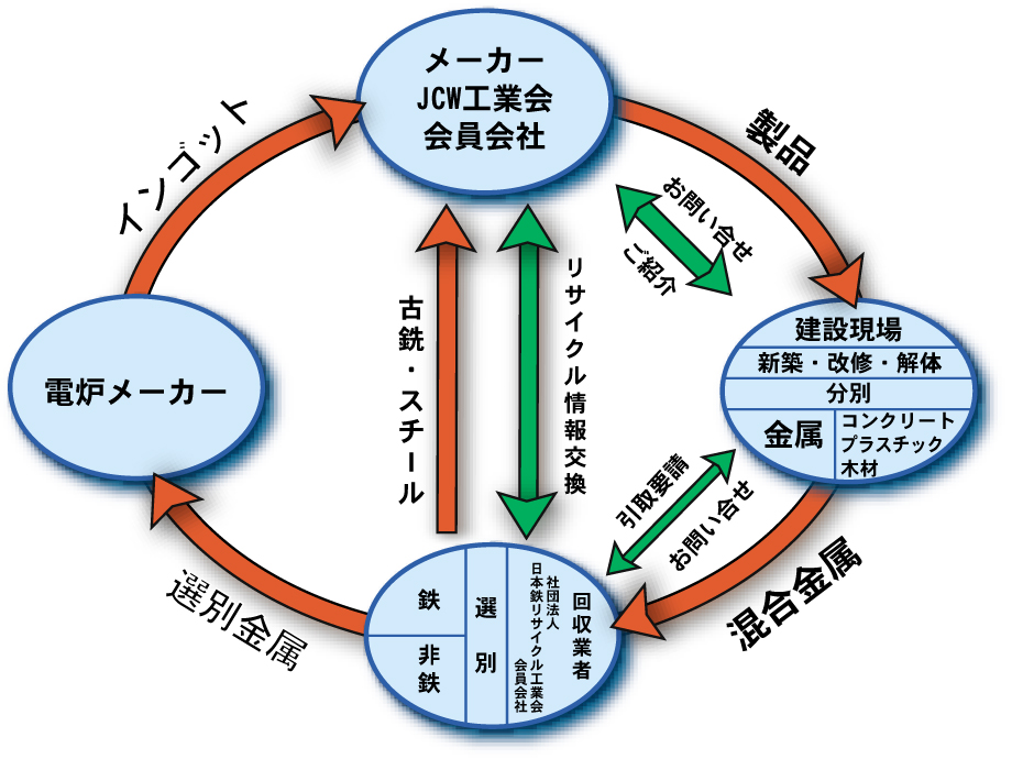 | JCW製品は多くの『いもの』の部品からできております。 建物や道路においてコンクリートやアスファルトと一体となって施工されますが、 多くの部品は容易に分別できます。 たとえばマンホールふたの場合、ふたはそのまま100%リサイクルできます。 床排水トラップ、ルーフドレンも同様に分別でき、『いもの』部品はほとんどリサイクルができます。 『いもの』で構成されているJCW製品はリサイクルにやさしい製品です。 |